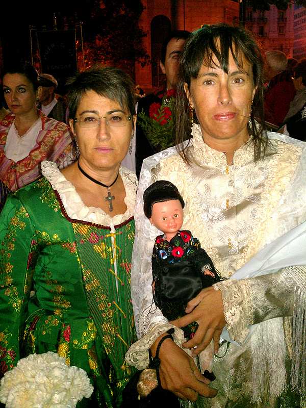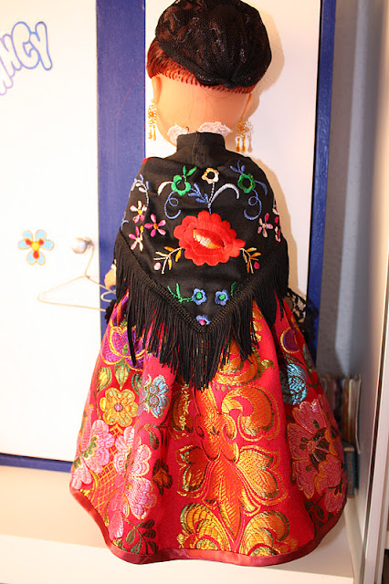 El traje es totalmente casero, la falda y el delantal de mama, la blusa de cuando era forera de una de las compañeras, el manton de los chinos, arreglado por mi , peluquera, mi hermana,....creo que no ha quedado nada mal, aunque quiero cambiarle los iris por unos de color marron, me parecen mas latinos.