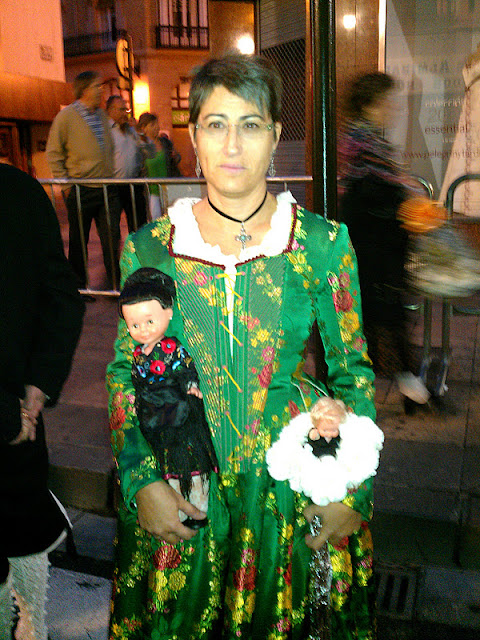 El traje es totalmente casero, la falda y el delantal de mama, la blusa de cuando era forera de una de las compañeras, el manton de los chinos, arreglado por mi , peluquera, mi hermana,....creo que no ha quedado nada mal, aunque quiero cambiarle los iris por unos de color marron, me parecen mas latinos.